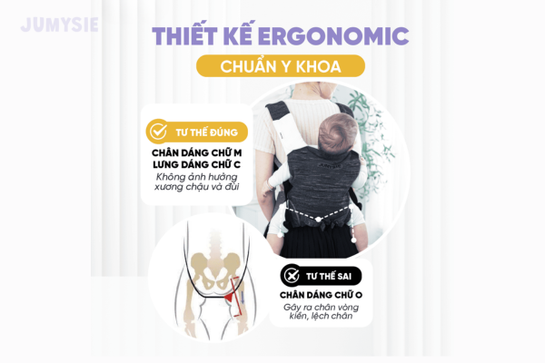 Địu trợ lực cao cấp E8 được thiết kế chuẩn ergonomic, đảm bảo nâng đỡ tối đa để hỗ trợ sự phát triển tự nhiên và an toàn cho bé. Tư thế chân cong chữ M và lưng cong chữ C giúp bảo vệ hông và cột sống non nớt của bé, đồng thời giảm thiểu nguy cơ mắc các vấn đề về xương khớp.