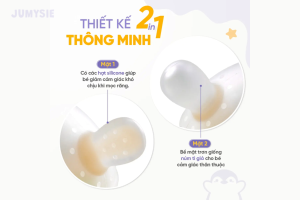 Sản phẩm được thiết kế thông minh với hai mặt sử dụng khác nhau, phù hợp với nhu cầu đa dạng của bé trong giai đoạn mọc răng: