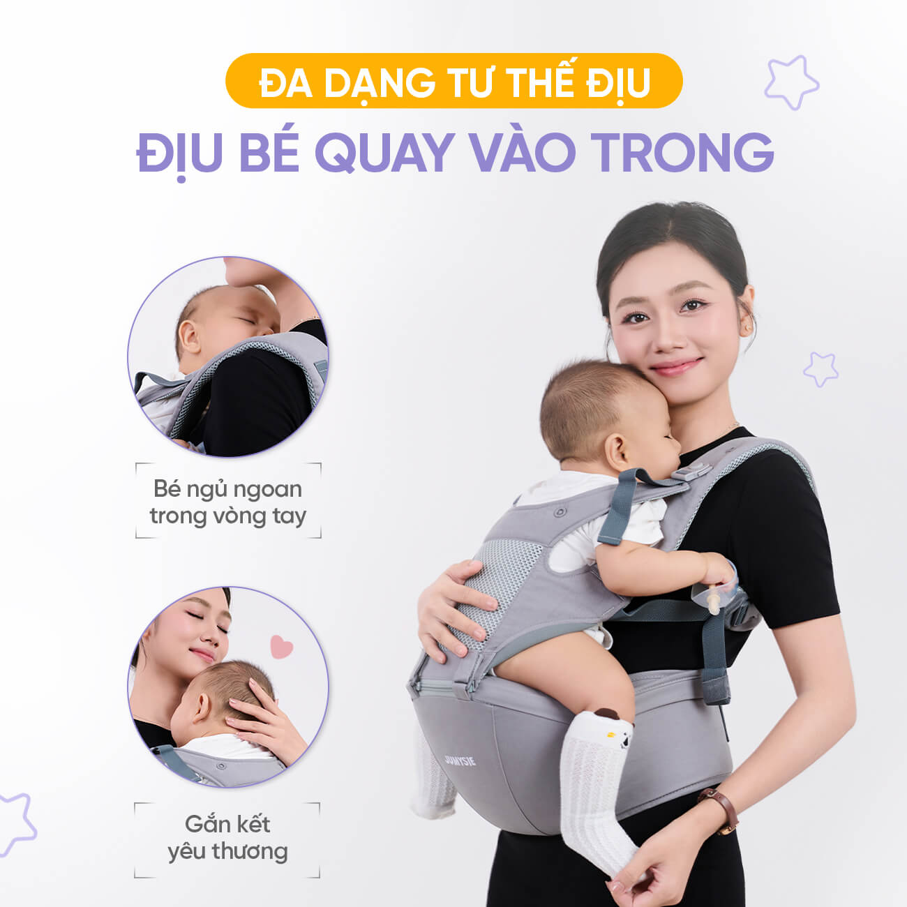 | Mặt Đối Diện | 5-36 tháng | Dỗ bé, bé ngủ, nơi đông người, gắn kết tình cảm |
