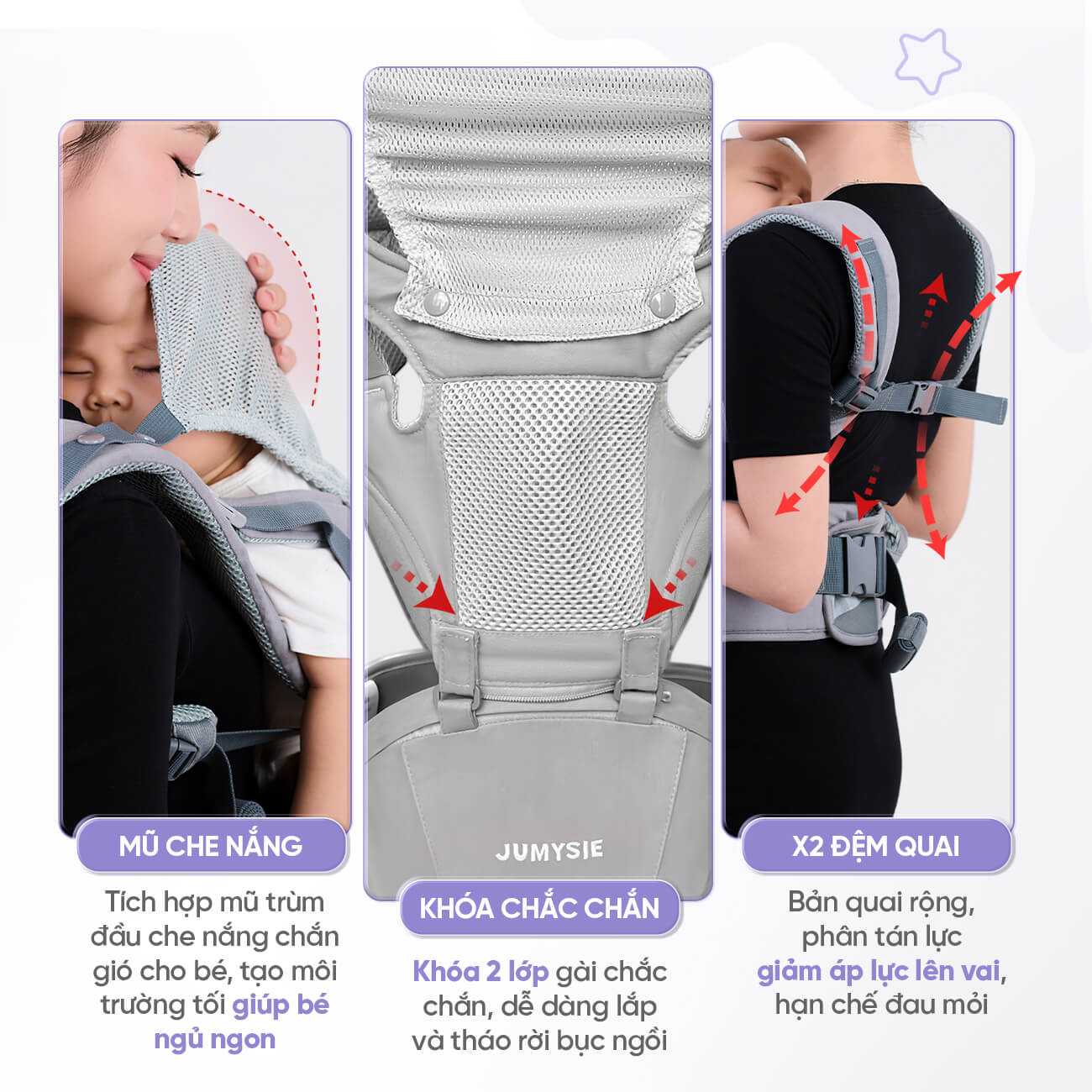 Địu em bé Jumysie M8 với 4 tư thế đa năng là người bạn đồng hành lý tưởng trong hành trình nuôi dạy con của bạn. Từ những ngày đầu tiên sau sinh cho đến khi bé 3 tuổi, Jumysie M8 luôn đáp ứng mọi nhu cầu của cả mẹ và bé. Với thiết kế chuẩn y khoa M-shape, chất liệu cao cấp an toàn, và các tính năng tiện ích vượt trội, Jumysie M8 xứng đáng là khoản đầu tư thông minh nhất cho gia đình bạn.